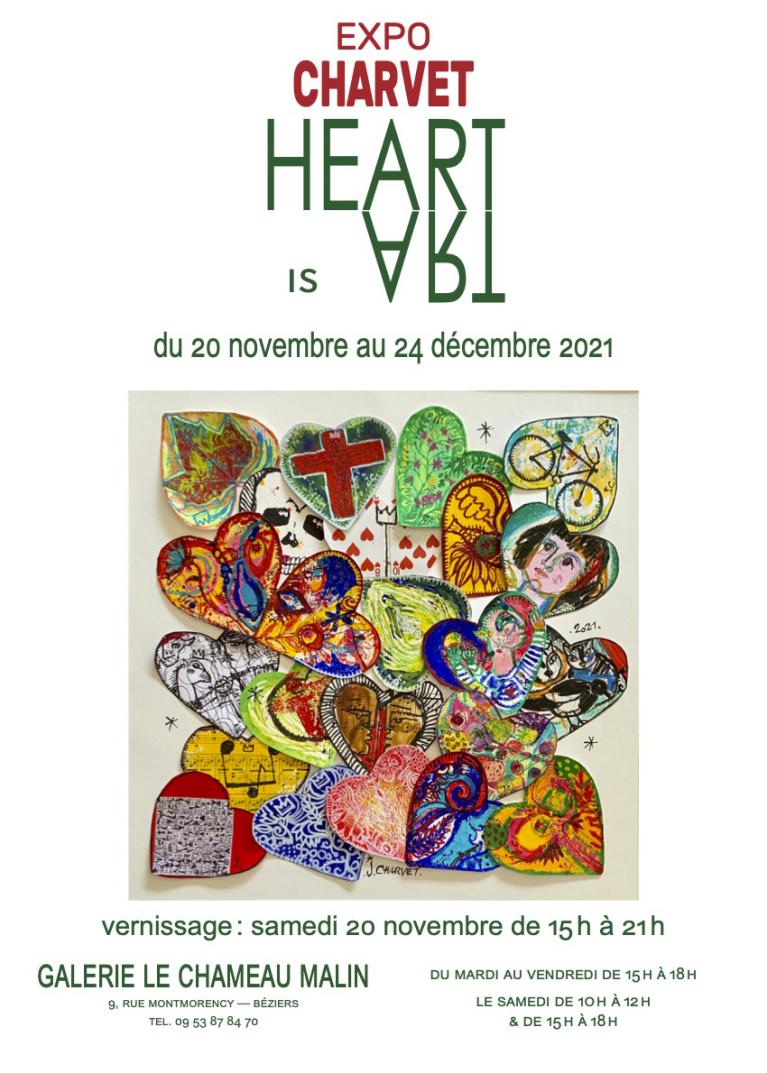 Charvet expose à la galerie du Chameau Malin le cœur au bout du pinceau. Cœurs sacrés et profanes. En boitage, en coffrage, par collage, sur toile, sur papier, sur objet, il décline le motif en nous ravissant parce qu’il use de ses atouts maîtres comme la dérision, l’humour, le décalage, le détournement des références ou de la matière. Charvet prend le cœur à bras le corps et fait un pas de côté pour mieux le fléchir grâce à sa technique de l’association libre et du réemploi. Il trempe dans sa peinture instinctive les couleurs acryliques, les encres, les craies et les crayons, pour que palpite l’origine du monde ou les envols de l’esprit, des sentiments ou de la chair. Nous nous interrogeons sur la technique et nous cédons devant cette joyeuse figuration libre qui a un cœur bien trempé.